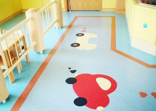 2.幼儿园室内专用PVC地板100%纯PVC耐磨层,厚度达1.5mm,并经防老化和紧固技术处理,耐磨耐压,使用寿命可达5—10年。