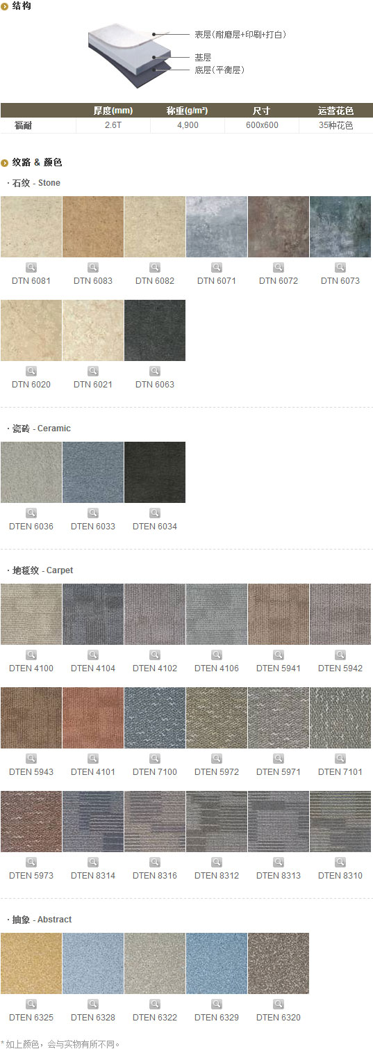 一款装饰性与实用性俱佳的片材地板。600 × 600的大规格设计,逼真的花色生动再现地毯、大理石和抽象纹等纹路,可为办公室、公共设施等场所营造舒适完美的装饰空间